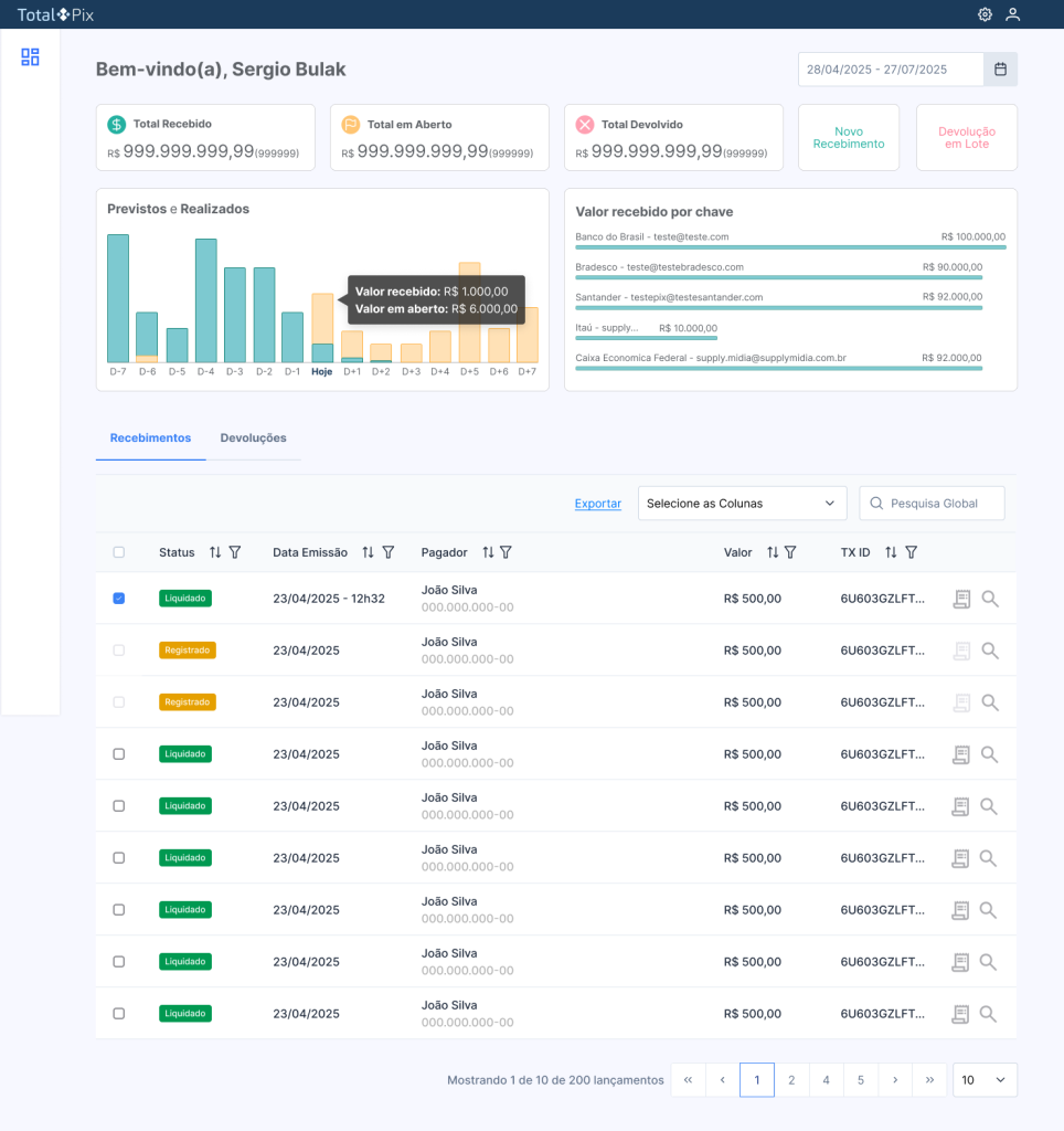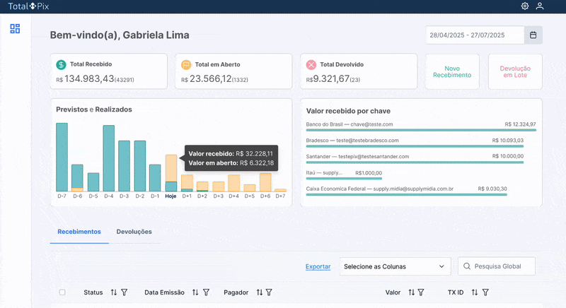 Nossa tecnologia foi pensada para escalar. Unifique a gestão de milhares de recebimentos e devoluções PIX em um só lugar. Substitua o manual dos bancos por um controle inteligente, automatize processos críticos e libere sua equipe para focar no que realmente importa: o crescimento.